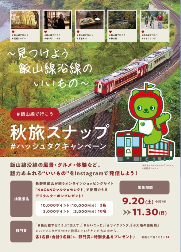 JR飯山線沿線のいいものを、見つけてください。 #飯山線で行こう ! インスタグラム投稿キャンペーン実施中です。 飯山線沿線の風景・グルメ・体験など、魅力あふれる“いいもの”をインスタグラムで自由に投稿してください! 抽選で15名の方に豪華景品をプレゼント中です。 応募期間は、令和7年11月30日(日)まで!