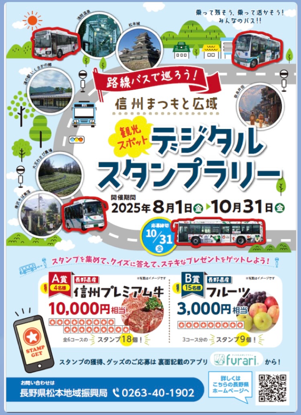 / 路線バスで巡ろう🚍 信州まつもと広域 観光スポットデジタルスタンプラリー開催中! \ ☑️開催期間 ~10/31(金) ☑️チェックポイント 18箇所 (観光スポット:6箇所、路線バス:6路線) ☑️デジタルスタンプを集めると 抽選で県産品をプレゼント🎁