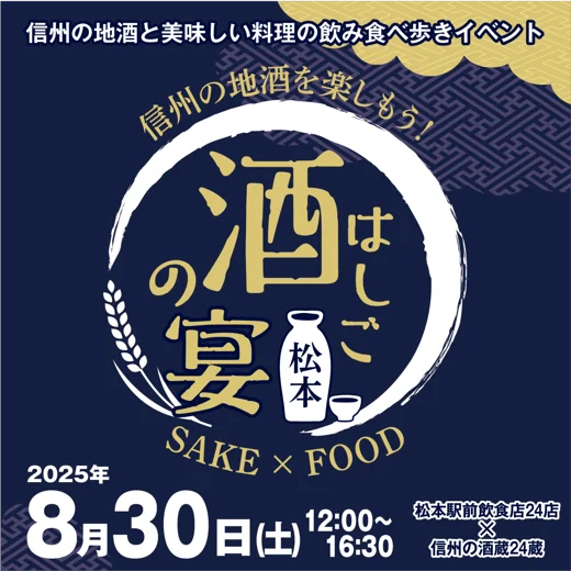 松本駅前新伊勢町通り・公園通り・市道を一部歩行者天国にして開催します。信州の厳選地酒と地元飲食店のおいしい料理を食べ飲み歩きしよう!