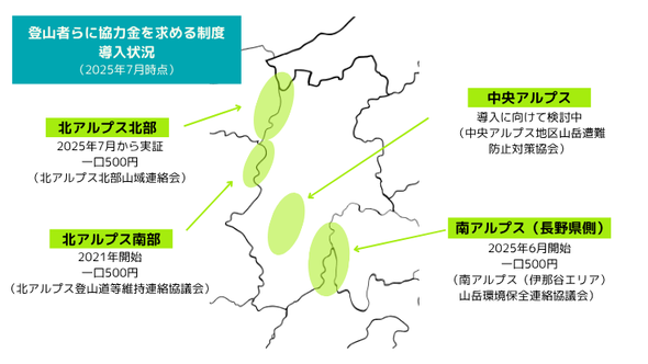 登山者に任意の協力金を求める制度の導入が各山岳エリアで進められています。